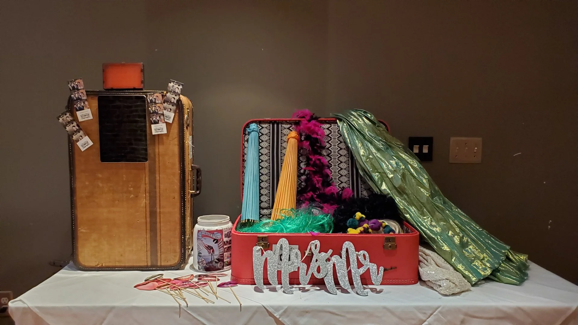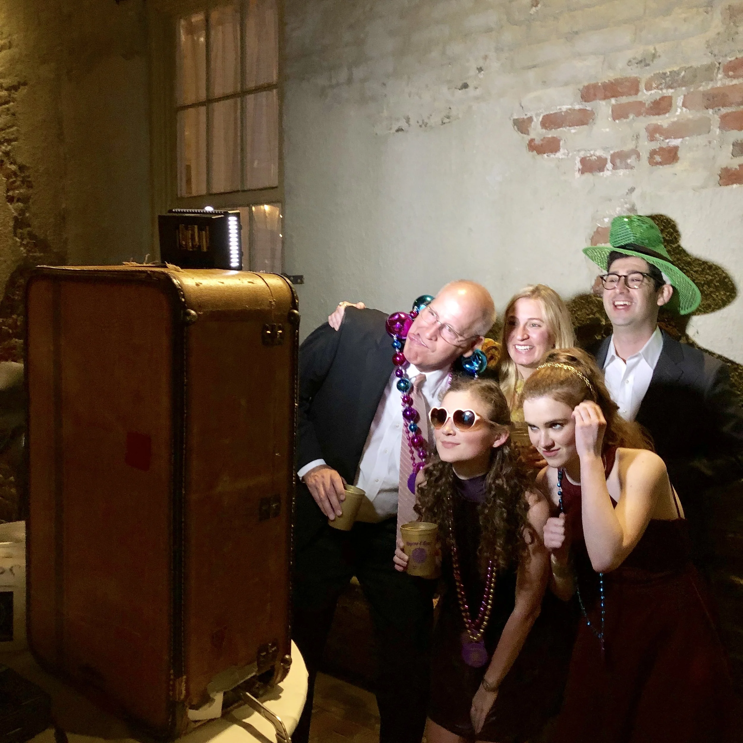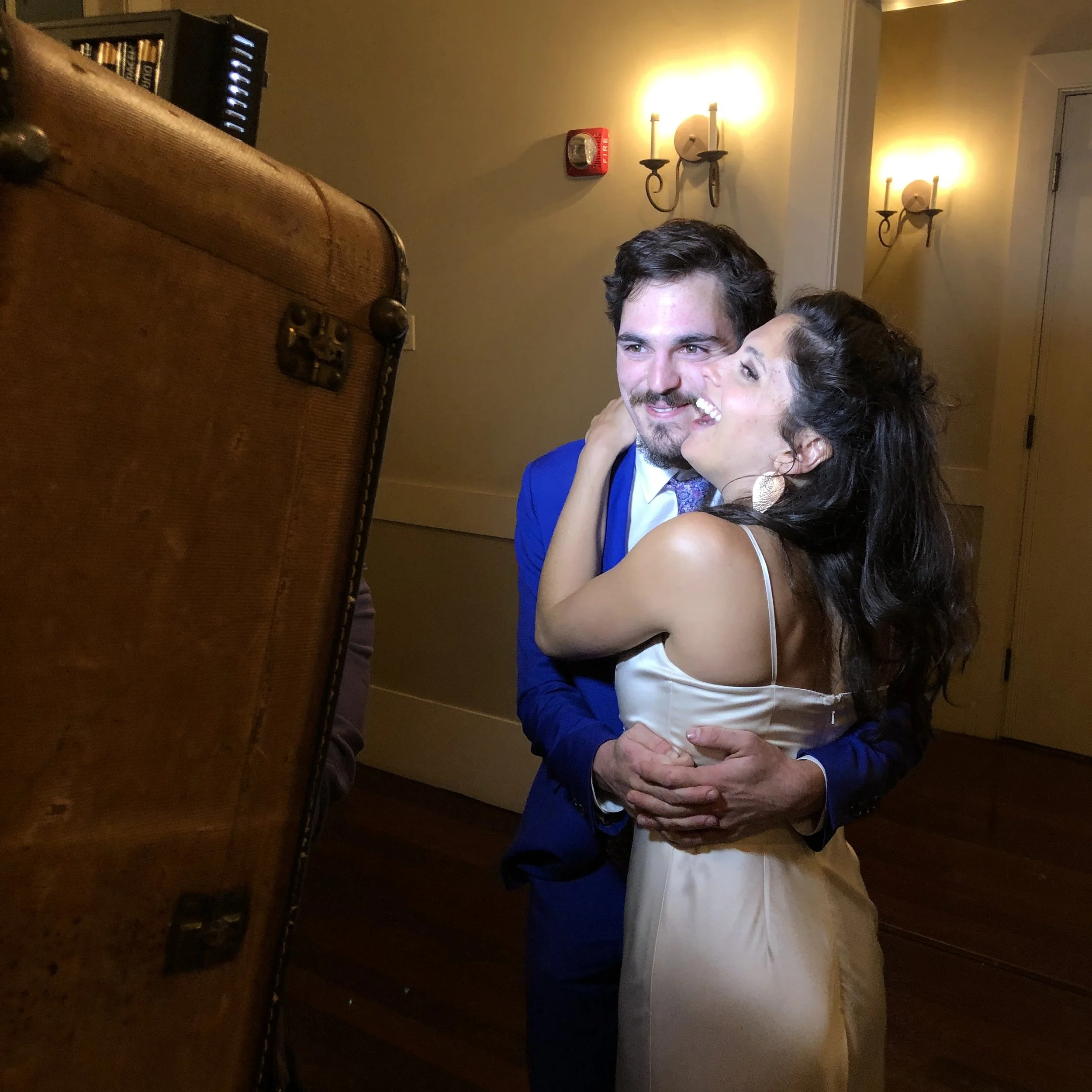 My hand-crafted photobooth fits in a vintage suitcase and sits on any tabletop, along with another suitcase of costumes and props. The photobooth operates like a traditional booth, but with added features for modern sharing. All the images are yours to keep!